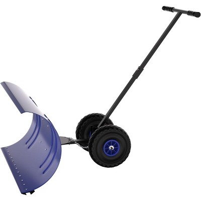 Wheeled Snow Pusher Shovel, Heavy-Duty Metal Construction with Adjustable Angle & Height Handle for Driveway, Garage, and Home