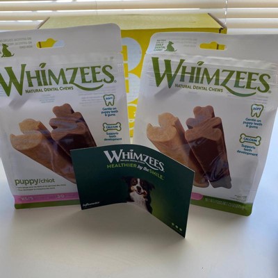 [This review was collected as part of a promotion.] I tried these treats out several times with our 6 month old puppy and he loves them! I usually buy greenies for dental care but they can get to be pretty expensive and I find they are too big for supposedly being a daily treat. These whimzee sticks are small enough that I feel okay giving our puppy a couple a week. Even our big lab loves one now and then.