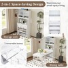 This space-saving buffet hutch combines a foldable 50.4" dining table and functional storage unit, perfect for small apartments and studios. The expandable table seats 4-6 (with removable leaves stored in the drawer) and tucks neatly under the 15.2"W workstation when not in use. Featuring two sliding glass-door cabinets, a storage shelf, and four side hooks, it keeps essentials organized while serving as a coffee bar, prep area, or desk. Crafted from durable P2 MDF with smooth-rolling wheels, this 33.5"L unit offers easy mobility. Available in three modern finishes, it maximizes functionality without compromising style in compact living spaces.