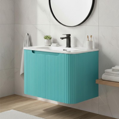 Introducing our independent bathroom vanity, featuring a unique pattern that offers extraordinary visual appeal under bathroom lighting. This stylish and functional cabinet provides ample concealed storage for all your toiletries and essentials, with a combination of a spacious cabinet body and a convenient drawer to keep items protected from dust and water stains. The soft-close doors and drawer fronts are finished with water-resistant paint for enhanced durability. Crafted from high-quality materials, this top-of-the-line bathroom cabinet is designed with functionality in mind, making it the perfect storage solution for any bathroom. Additionally, it comes equipped with a three-hole basin suitable for faucets with a diameter of up to 32mm. Transform your bathroom into a stylish and organized space with this exceptional vanity.