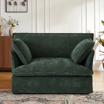 This modern armchair combines elegant design with exceptional comfort, featuring gracefully curved arms and a stylish skirted base. Its extra-wide seat with deep cushioning provides ample room for stretching out and relaxing. Upholstered in soft skin-friendly chenille fabric and filled with high-density foam, the chair delivers cloud-like comfort while maintaining durability through its solid wood frame. Two versatile oversized armrest pillows can be used for additional support or as decorative accents. This armchair serves as both a comfortable retreat and a sophisticated centerpiece for any living space.