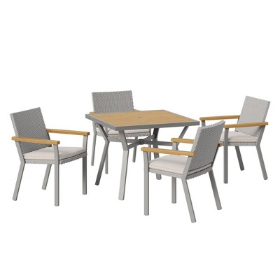Enjoy outdoor dining in style with this 5-piece patio wicker dining set. Built with a rust-free powder-coated steel frame and hand-woven PE rattan, it offers lasting durability for outdoor use. The acacia wood tabletop adds natural beauty while providing a safer surface than glass. Ergonomic chairs with wide seats, high backrests, and acacia wood armrests deliver upgraded comfort. Adjustable feet on both table and chairs ensure stability on uneven ground. The black wicker paired with creme cushions creates a modern, elegant look, perfect for patios, gardens, or balconies. Easy to assemble and maintain, ideal for year-round outdoor living.