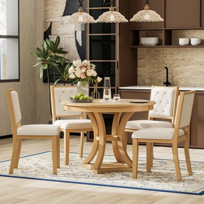 Elevate your dining space with this 5-piece vintage dining set, thoughtfully designed for both style and versatility. The centerpiece is a round, extendable table veneered in natural oak, showcasing beautiful wood grain for a warm, rustic touch. Effortlessly adjust the table from 42" to 58" using the removable 16" leaf, comfortably seating four to six people for family meals or gatherings. Each chair features a solid wood frame with elegant lines, thick cushioned seat, and padded backrest, ensuring comfort and support throughout long dinners. Perfect for everyday dining or entertaining, this set brings vintage charm and practical function to your home.
