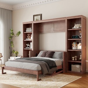 Crafted from high-quality solid pine wood and durable MDF, this space-saving murphy bed frame is built for long-lasting stability. It cleverly folds vertically into a sleek cabinet, instantly freeing up valuable floor space for daytime activities. An integrated panel serves as both a handy shelf and a functional work desk, offering convenient storage and a practical work surface. Additionally, multiple open storage racks are situated on both sides of the bed, providing ample and organized space for books, accessories, clothes, and other personal items, helping to maintain a tidy and clutter-free room environment.