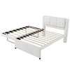 This upholstered platform bed is designed for both comfort and durability. Constructed from solid pine wood and MDF, it offers a sturdy foundation with a high load capacity to ensure long-lasting use. The bed features a soft linen leather headboard, providing a comfortable and supportive surface for your back during long nights or lazy mornings. Additionally, the multifunctional pull-out trundle is perfect for sleepovers, taking up minimal space while offering an extra sleeping area. The trundle can be used directly on the ground or raised to the same height as the platform bed for added convenience. The wood slats eliminate the need for a box spring and provide reliable support for your mattress. Assembly is simple with clear instructions and pre-drilled holes, allowing for easy setup.