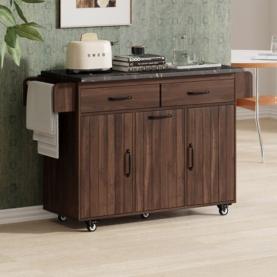 - The kitchen island has two large drawers, two storage cabinets, and removable shelves inside the cabinets to freely separate storage space.