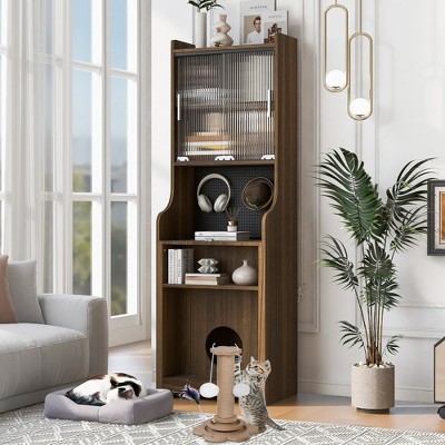 Blending style and utility, this walnut side table doubles as a discreet cat litter box—perfect for modern homes. The acrylic flip-up door ensures easy access for cleaning and maintenance, while the spacious interior makes litter replacement simple. A designated cat litter channel helps contain messes, keeping your home tidy. The base features flexible rollers that can be locked in place or moved as needed, offering versatility in any room. Crafted from premium materials, this piece prioritizes safety for both pets and people. Its sleek design allows it to function as an organizer, decorative accent, or storage solution, seamlessly fitting into various spaces while providing your cat with a cozy, private area.