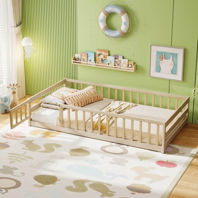 This Twin Size Floor Bed with Fence and Door creates a safe, magical space for your child's development. Crafted from premium rubber wood with eco-friendly paint, it features full surrounding safety guardrails and a convenient revolving door with steel latch for secure access. The 7 reinforced slats provide sturdy support, while the low-profile design helps transition children from co-sleeping to independent sleeping. Perfect for small spaces, it serves as both a safe sleeping area and play space for learning to walk and climb. Easy to assemble with included hardware and instructions, this durable floor bed combines safety, functionality and child-friendly design in one compact package.