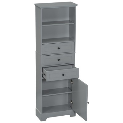 This vertical storage cabinet is a perfect blend of style and functionality, crafted from high-quality MDF boards with a smooth, waterproof painted finish that ensures easy maintenance. The cabinet includes open storage shelves, three large drawers with metal slides for easy opening and closing, and one enclosed cabinet at the bottom for more concealed storage. Its adjustable shelves provide flexibility, allowing you to store items of various sizes, from bathroom essentials like shampoo and towels to office supplies. The design is both elegant and practical, featuring decorative top edges, an arc base, and groove patterns that enhance the cabinet's aesthetic appeal. This versatile piece is suitable for various settings, including bathrooms, offices, living rooms, and studies. For safety, the cabinet is equipped with an anti-toppling device, ensuring stability, especially in homes with children.