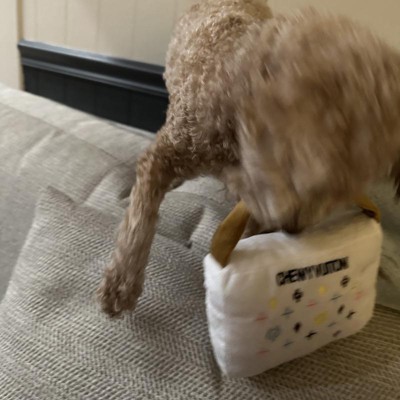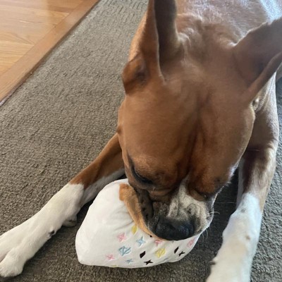 [This review was collected as part of a promotion.] Our four-year-old boxer dog absolutely loves this dog toy. This dog toy is named “chewy Vuitton”. A play off of the Louis Vuitton fashion line. This toy is the perfect size in measures about 6“ x 6“ and has a piece of material that mimics a handle. The best part about this dog toy is that it squeaks. Our dog loves running around with it and playing. This also has other matching dog accessories. I received an incentive to write this review.