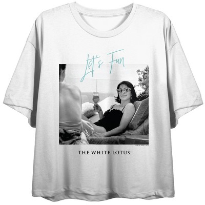 - CUSTOM DESIGN: Make a statement with the custom design of this White Lotus crew neck short sleeve t-shirt. Lucia Greco's image and the playful "Let's Fun" lettering create an eye-catching look that reflects your individuality.