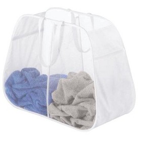 Whitmor's new 6233-4103-WHT Pop & Fold double laundry hamper was created with the slanted sides to give you more capacity. Divided into two halves, you can presort your laundry. The polyester mesh is moisture proof and allows damp laundry to breathe. All of our Pop & Fold products are easy to set up with the flexi-frame system. Measures: 12" x 28" x 21".