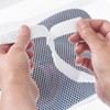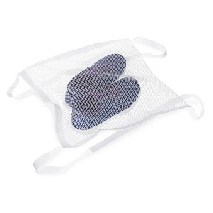 The top of the mesh bag has a Velcro closure and there are Velcro closures on both ends of the PP strapping handles so the unit can wrap around a laundry dryer. Made out of polyester mesh and polypropylene strap handles. Dimensions: 0.25 L x 15.0 W x 15.0 H inches.