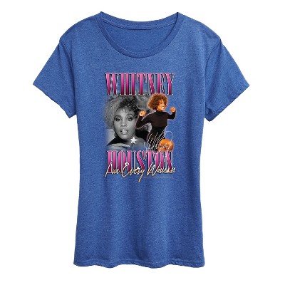 • CUSTOM DESIGN: Photo art of Whitney's face and Whiteny flexing decorate the front of this graphic tee while blue letters above and below the image spell out the singer's name. Whitney Houston fans will love this fun design.