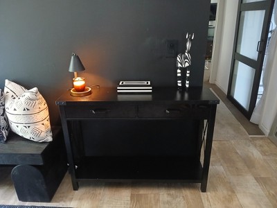 Very nice console table! The table has a beautiful black finish that resembles real wood. It's very sturdy and a great value for the price! Target was superfast in delivering it. I ordered 1 August and received 2 August. That is amazing service. Thank you. The directions were good in some sections and confusing in others.