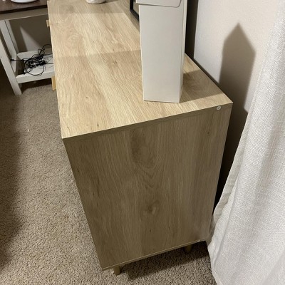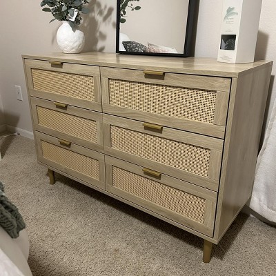 6 Drawer Rattan Dresser with Railed Edge, Wooden Storage Chest of Drawers, Modern Rattan Double Dresser with Metal Legs and Gold Handles,Walnut