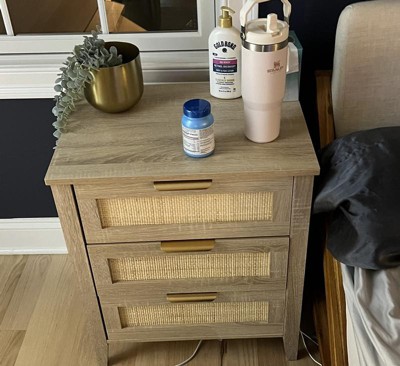 Whizmax Rattan Nightstand, Night Stand with 3 Drawers, Farmhouse End Table with Metal Handle, Bedside Table for Bedroom Living Room Small Space Black
