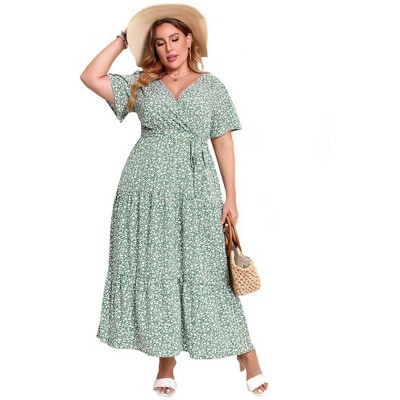 WhizMax Women's Plus Size Square Neck Ruffle Sleeve Flowy Floral Summer Midi Dress with Pockets(Green flower,3XL)