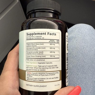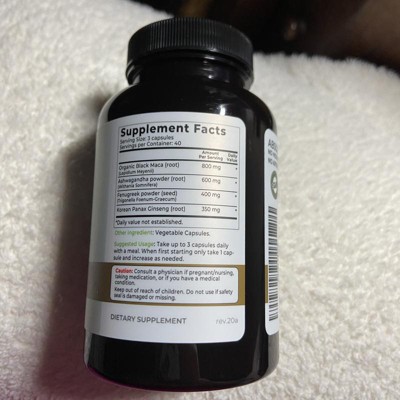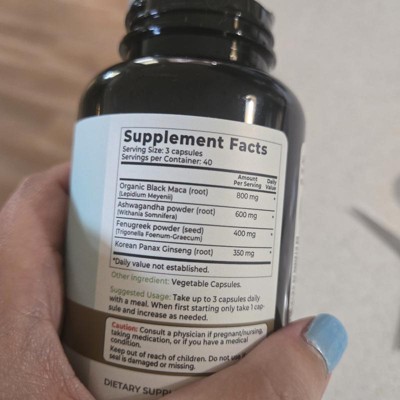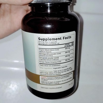 [This review was collected as part of a promotion.] This is an effective dietary supplement containing black maca, ashwagandha, fenugreek and panda ginseng. It is a vegan supplement that is gluten free too. The item is GMO free. There are no fillers in the capsules and there is no gelatin. No artificial dyes are used and the product is made in the USA. Starting with one, you can slowly increase to three capsules a day. I received an incentive to write this review.