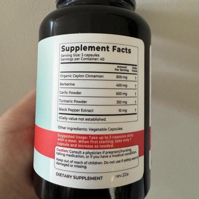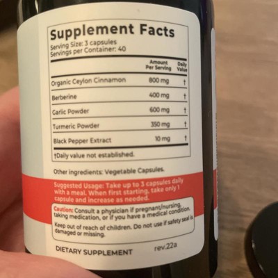 [This review was collected as part of a promotion.] These supplement capsules include Ceylon cinnamon, garlic, berberine, turmeric, and black pepper, that is quite a concoction and while they have a mild smell. The taste is really pretty bland, considering all the potent ingredients inside. I’ve only been taking one a day for right now, and as the usage instruction suggest you can work your way up to three capsules daily. it’s only been a few days so far, so I’m not quite sure of the effect but so far I haven’t had any side effects or stomach issues or nausea from this supplement. it seems like a pretty good value for a five and one supplement that is vegan and gluten-free and made in the USA. I received an incentive to write this review.