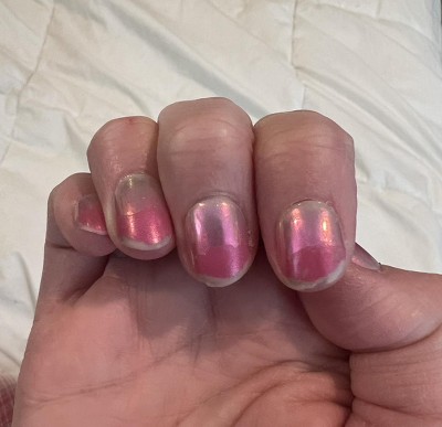 [This review was collected as part of a promotion.] The color, style, and design of the nails are lovely. Sadly, I’ve had them on for 3 days and the top, shiny chrome layer is coming off. I’d expect that to happen after over a week of wear, but 3 days is disappointing. It makes them look bad.