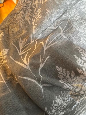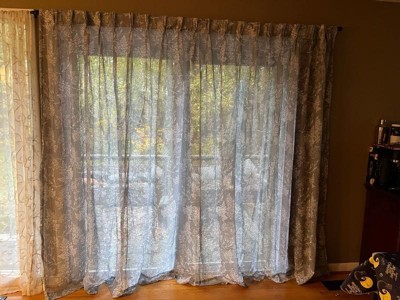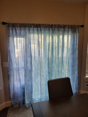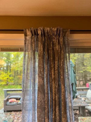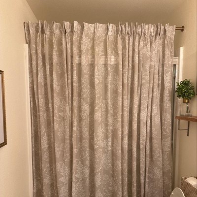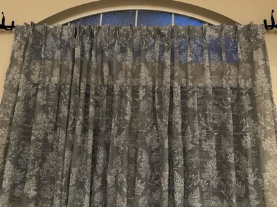 This semi-sheer floral printed fabricbrings warmth and elegance to any space. This exquisite stylefeatures characteristics of any custom window covering, addinga rich look to your home. Available in Linen, Grey and Blue all having an off-white floral motif. Made from 100%polyester this style comes in 100" Wide panel. Each patio panel comes has a 2 to 1 fullness where the top of each panel measures 100" W with 20 pinch pleats and 21 back tabs. These curtains all feature a 2-pinch pleat design with a 4" length header and 2" W back tabs. Each panel has 1" side hems and a generous 4" bottom hem that flares wider at the bottom allowing the panel to drape elegantly. Safe to toss in the washing machine for easy upkeep. Decorative rod and drapery pins sold separately.