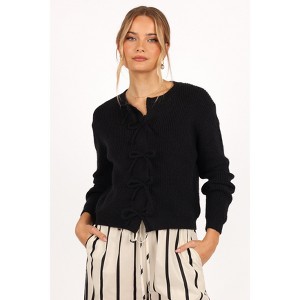 This cardigan boasts a timeless round-neckline and long balloon sleeves, finished with ribbed cuffs that gently hug the wrists. It's the bow feature that truly sets this cardigan apart each artfully accentuated against each button, creating a stunning classic visual that's bound to turn heads.