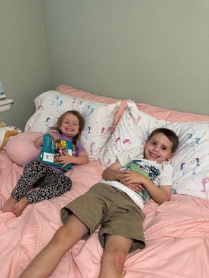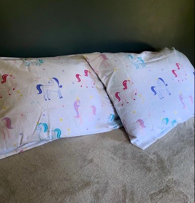 [This review was collected as part of a promotion.] How cute and girly are the unicorns?! Such a great addition to a pink puffy bed. The light pastel colors are so pretty look at and I love that it has multiple colors. The pillowcases are flannel which are so incredibly soft, but also warm. They also take longer to dry in the dryer, but that’s not a big deal, just wanted to share. Easy to wash with a regular load of laundry. They fit a normal queen sized pillow easily. My daughter is thrilled and her brother loves hanging out on them as well.
