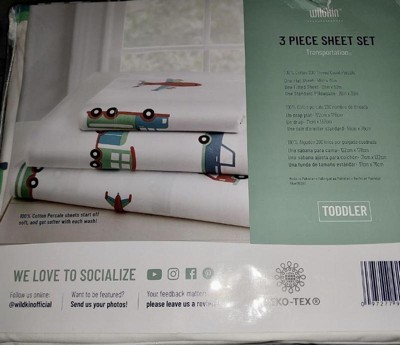 [This review was collected as part of a promotion.] The lightweight, breathable, transportation themed, 100% cotton, 200 threat count percale "Wildkin Kids Toddler Sheet Set" includes a 48"x70" flat sheet, a 28"x52" fitted sheet and one 20"x30" standard pillowcase. After a cold wash neither the vibrant design colors nor the fabric softness did not fade. In short, the Wildkin Kids Toddler Sheet Set exemplifies comfort, style and high quality stitching.