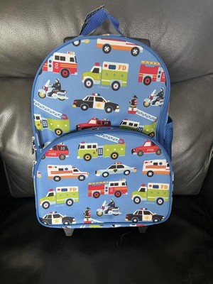 [This review was collected as part of a promotion.] This Wildkin Heroes Rolling Luggage is an awesome bag. It has one large compartment and one small compartment in the front. It also has a mesh pocket on the side. Rollers make it easier to carry from one place other. The print of police car, for truck is very nice! Very well made. One thing I would have preferred if they would have given straps to hold it on shoulders. But overall a good rolling luggage for kids.