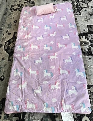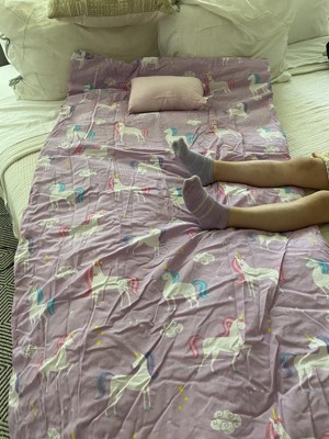 [This review was collected as part of a promotion.] This unicorn sleeping bag is our little girl's favorite "blanket". She carries it through the house and covers up all her stuffed animals with it while playing. I have to put it through the wash when she's in the bathtub just so she doesn't cry that I took it away. She keeps saying, "It's So Pretty"