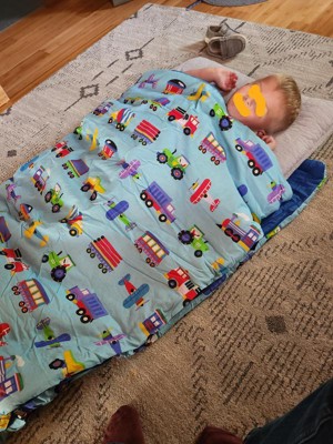 [This review was collected as part of a promotion.] Wildkins Trains, Planes & Trucks Sleeping Bag is a bright and colorful sleeping bag for boys with the plane, trains and trucks design that all boys love! This is well made soft cotton blend and great quality fabric. It is perfect for sleepovers, camping, parties, traveling and on the go and it comes with a matching drawstring closing storage bag for carrying. The sleeping bag has the colorful design on one side and dark blue on the inside and it is really warm for those cold nights. The zipper is easy to open and close and unzips the full length to become a blanket and has elastic storage straps to keep the bag rolled up for storage. My almost 3 year old loves it and uses his own vehicles while playing with it. It is almost 5 feet long and will work for most toddlers. I highly recommend the Wildkins Trains, Planes & Trucks Sleeping Bag that is perfect for the toddlers and an extra place to sleep in comfort!