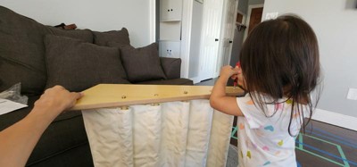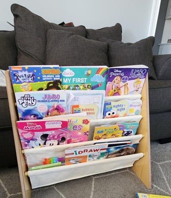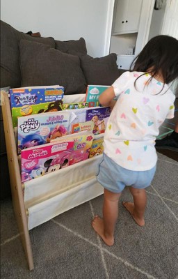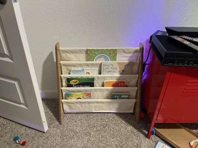 [This review was collected as part of a promotion.] This is the most perfect bookshelf for my toddlers. I absolutely love how perfect and put together this is. It’s low enough that my kids can take and grab their books but it’s sturdy enough to know that it won’t collapse if they put too much pressure on it. I ADORE this book shelf and my kids do too. I love that the slings are fabric rather than plastic so it’s very hard for a child to break it. I recommend this 100%.
