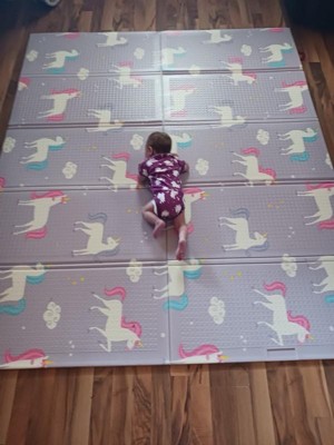 [This review was collected as part of a promotion.] The mat provides great cushioning, which is ideal for babies just learning to craw. It's soft but still firm enough to give support to the baby. I also find it comfortable enough to sit on while playing with the kids. The surface is easy to clean. I really liked that it is reversible, it has a rainbow 🌈 design in one side and a unicorn 🦄 design on the other. I’ll be looking into this brand and maybe getting another one with different designs.