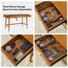 This mid-century modern computer desk has three drawers, including cable management, and a modular tray. Crafted with a beveled wood frame and solid wood legs, this desk boasts a timeless design. Its natural wood grain finish enhances the aesthetic appeal. The built-in modular tray provides easy organization, while the hidden wire management system keeps cords out of sight. Allows you to place a computer monitor or an iMac on your desk. The design makes it a perfect addition to any home office or workspace. Transform your workspace with this elegant mid-century modern piece, embodying the perfect blend of retro charm and contemporary practicality.