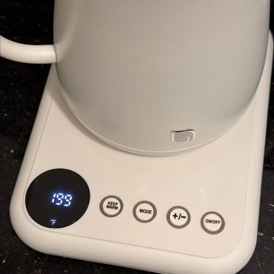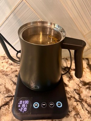 [This review was collected as part of a promotion.] I’m loving this kettle! First off, the design makes it impossible for water to splash out while you’re pouring - very targeted pour! The digital display clearly indicates what temperature it’s at, and it lets you know when it’s done. I was worried about the lid being too hot to take off initially but it’s okay. You do need to be careful, but it’s not as hot as it seems it could be. Beautiful matte black! I’m not sure if it will scratch with time, but so far so good!