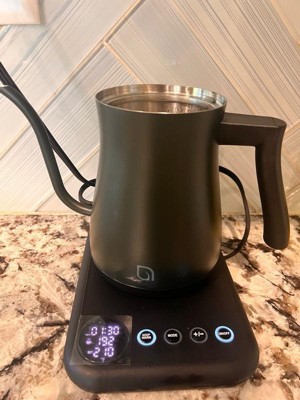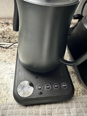 [This review was collected as part of a promotion.] I was in need of a new electric water kettle so I was excited to receive this one. It warms up water quickly and I like that there are different temperature settings depending on if you are drinking coffee or tea. Also, the goose-neck makes pouring water easy. So far its it’s been easy to clean and looks nice on my counter. The only con is the color is not truly black. When in the light you can see that the main body of the kettle is a dark green with a black handle and base.