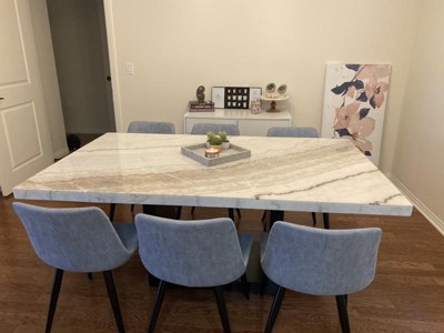 This table is absolutely beautiful! I was nervous purchasing it at first but I’m glad I did. The first one that arrived had two large chips on the tabletop, but I got a replacement sent right away. Assembly was easy, but it is very help so you need help. Great price for what you get. Very sturdy.