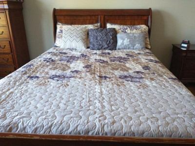 [This review was collected as part of a promotion.] I got the Madison Park-Luna 6 piece printed quilt set with throw pillows and put it on my queen size bed in the master bedroom. The quilt has a nice soft and silky feel to it. There were also two pillow shams that were easy to put over my pillows and 3 throw pillows that tied it all together.