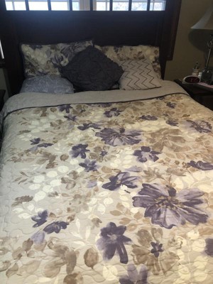 [This review was collected as part of a promotion.] I absolutely love everything about this quilt set. It comes with a quilt, two shams and 3 decorative pillows. Each piece is made very well. The fabric is lightweight but it does keep you warm. I love design and colors it offers. It has beautiful purple colored flowers and beige leaves in a delicate design on the quilt and two shams to match. The three pillows are also comfy. One has a design and the other two are different pretty purple colors. This set has made my bed look absolutely stunning and I love that it matches well with my bedroom decor. It's a great set to have.