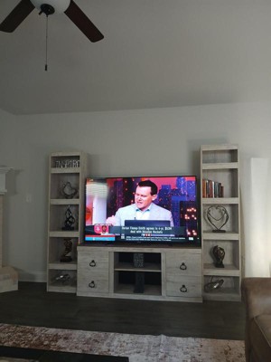 This TV pier is the ultimate statement piece for your coastal cottage or shabby chic inspired retreat. Whitewash finish is wonderfully easy on the eyes. It’s a driftwoody look that has our minds drifting away to beachy-keen escapes. Signature Design by Ashley is a registered trademark of Ashley Furniture Industries, Inc.