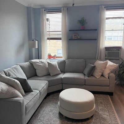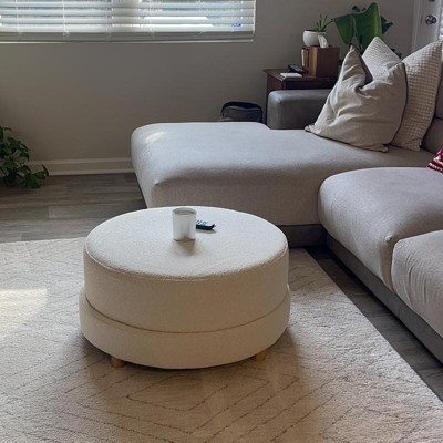 - Cream ottoman integrates into a range of decor styles