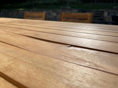 The table is beautiful but I cannot see how this is an outdoor table. We have had it out for a week a two and already we started noticing splinters and buckled slats. Chairs seem to be fairing ok so far compared to table.