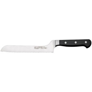 While this knife's serrated edge is perfect for cutting through tough crusts, its 8" long blade helps you slice large loaves of bread with ease. Offset bread knives help prevent your knuckles from hitting the cutting surface and are ideal for use in delis and markets. Great for delis and markets.