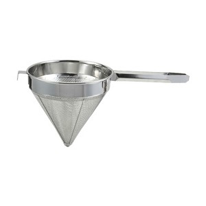 Sporting a conical design with fine mesh, the Winco fine mesh China cap strainer is perfect for removing clumps from any mixture, like stocks and bisques. In addition this strainer has a wide easy-grip handle and a convenient support hook that can be used for balance by resting it on the rim of the pot as you work. Thanks to its stainless steel construction, this china cap strainer will withstand years of heavy duty use and constant cleaning.
