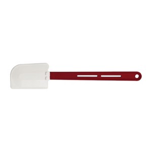 Crafted from silicone, the Winco scraper won't damage expensive metal pans and pots and will endure high temperatures while maintaining its shape. This scraper features a flat-shaped blade to easily scoop and scrape food off flat and curved surfaces. It also has a long handle for reaching into deep bowls or containers without getting your hands dirty. This model is also BPA free and NSF listed.
