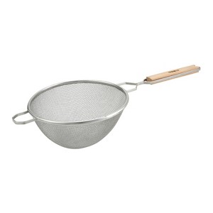 Sporting a double fine mesh concave net, the Winco strainer facilitates fast and thorough draining of excess oil, water, and other liquids. Thanks to its durable tin construction, this strainer will withstand heavy duty use while maintaining its shape. The flat wooden handle which keeps your hands safely away from heat and a sturdy metal hook allows this strainer to easily rest on a bowl for stability during straining.