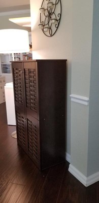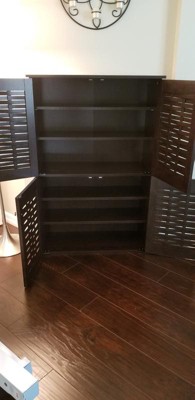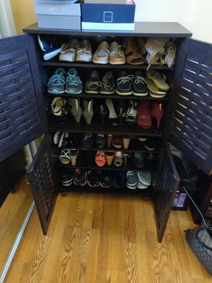 A: Hello, This is dependent upon the size of your shoes. The shoe cabinet can hold up to an estimated amount of 18 pairs of shoes in the 4-door cabinet. Full Dimensions: 48.17" High x 29.95" Wide x 13.1" Deep; Shelf/Drawer1: 6.46" High x 28.03" Wide x 11.5" Deep; Shelf/Drawer2: 6.54" High x 28.03" Wide x 11.5" Deep; Shelf/Drawer3: 7.78" High x 28.03" Wide x 11.5" Deep; Shelf/Drawer4: 6.87" High x 28.03" Wide x 11.5" Deep; Shelf/Drawer6: " High x " Wide x " Deep; Shelf/Drawer6: 7.09" High x 28.03" Wide x 11.5" Deep;