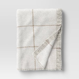 Add a layer of warmth and comfort to your bed or couch with this Windowpane Boucle Throw Blanket from Threshold™. Made from recycled polyester woven material, this boucle throw blanket envelops you in pure, soft comfort whether you're enjoying a quick nap or watching tv. The cream throw blanket boasts a neutral windowpane pattern with fringe detailing on the edges for a cool look that blends effortlessly with any decor style or color palette.