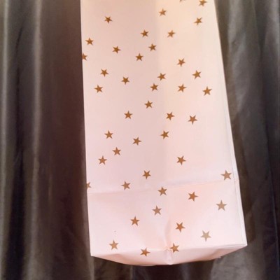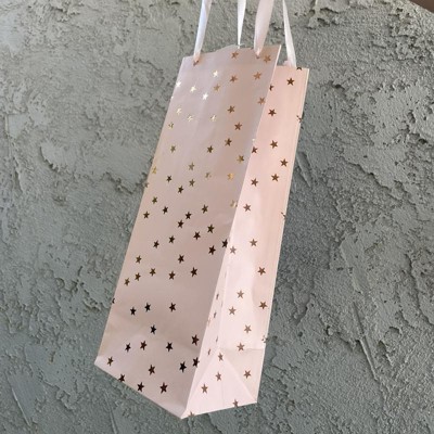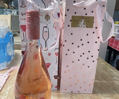 A: The wine bag features a pink hue with gold foil stars for a celebratory style.